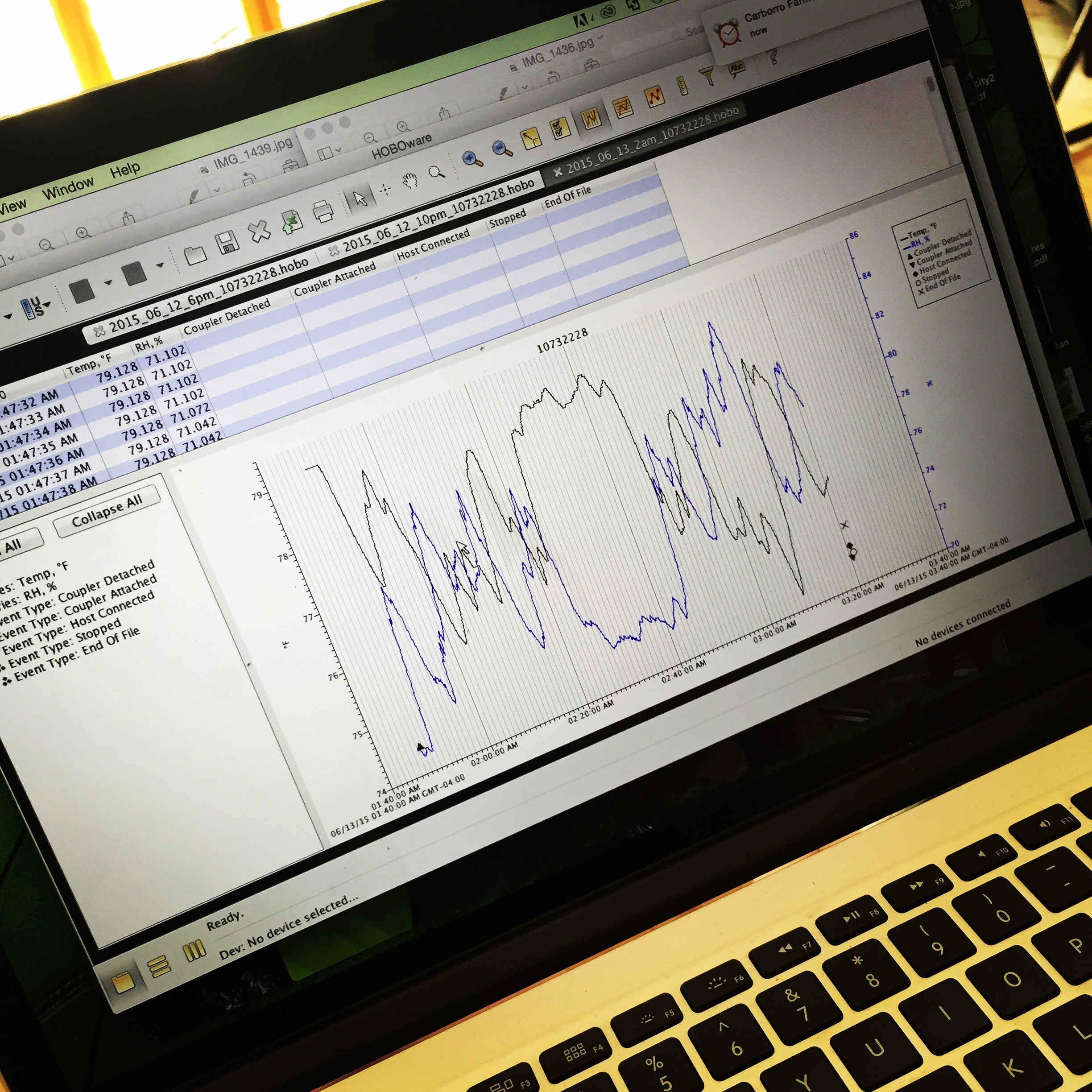 With the mount ready, and the weather window open, it was time to get transecting! (Yes, I made a verb out of transect.) Starting at 6 am on Friday morning, I drove the predefined route every 4 hours (6 am, 10 am, 2 pm, 6 pm, 10 pm, 2 am). Each run to Durham and back took an average of 1:45, and was 46 miles. That totals up to some 280 miles and about 10 hours of driving. On each run, I collected temperature, relative humidity and GPS data every second. That’s a lot of data! That’s a lot of NPR.