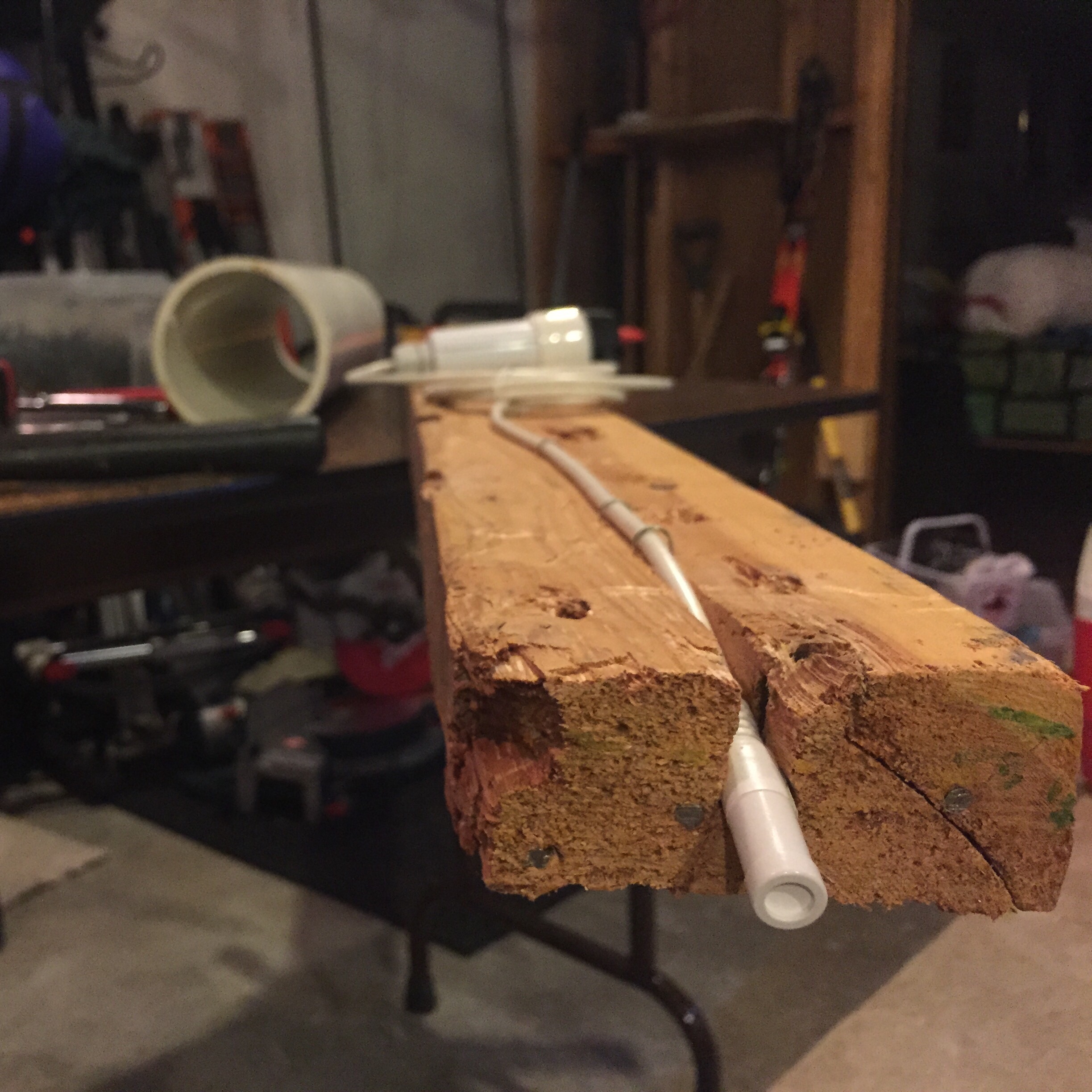 The design required an old 2-by-4, in this case harvested from an old renovation project around the house, and a two foot section of 4″ PVC pipe, also left over from a house project. Using a circular saw and drill, a seat for the external HOBO sensor and a notch for the chord were created in the end of the 2-by-4. The sensor was installed in its home and the chord stapled down to the beam using chord staples. Of course we have a chord stapler. Who doesn’t?