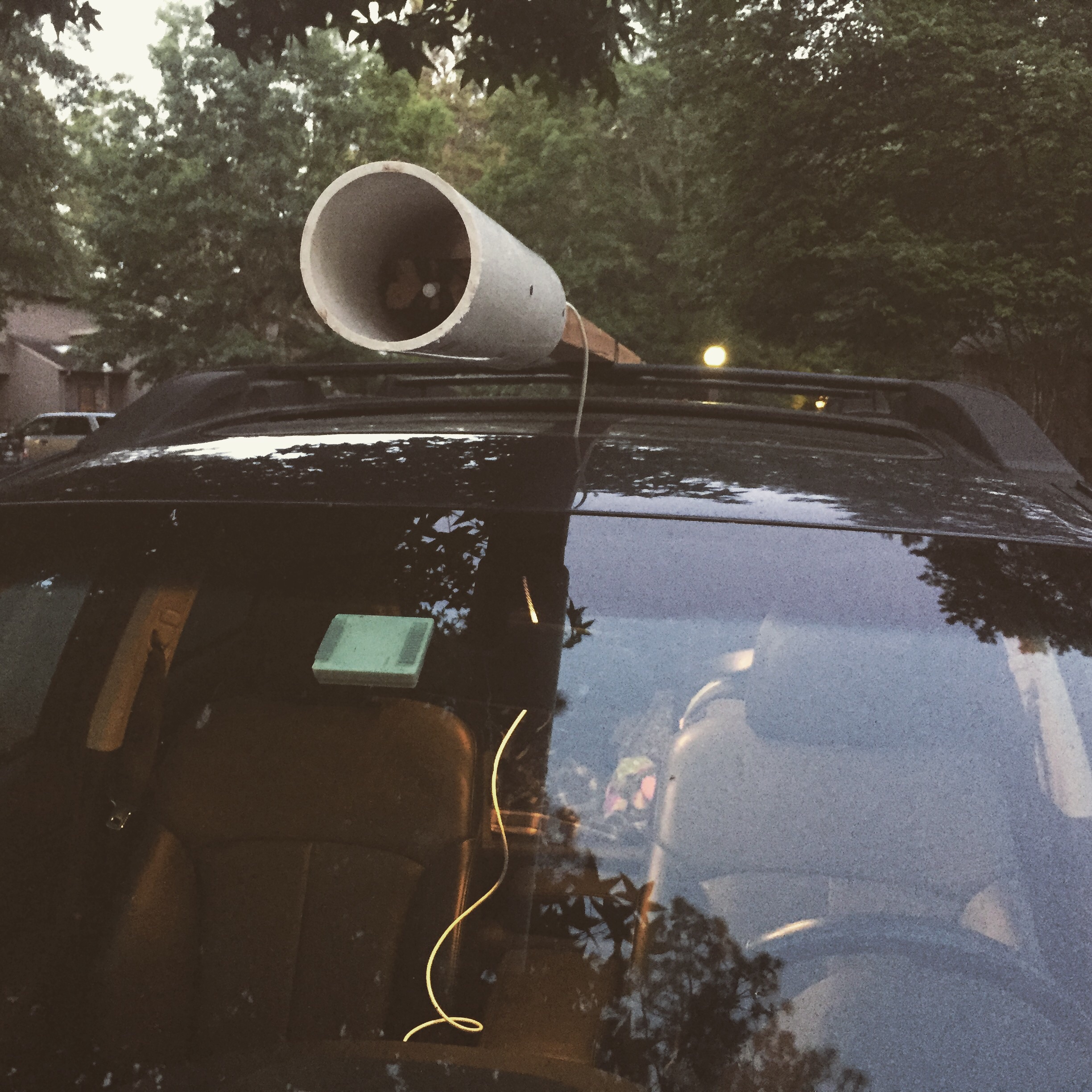 The PVC pipe was installed over the sensor after a bit of electrical tape was wrapped around the sensor for good measure to make sure it didn’t move in the wind. Then I drilled out two sets of 4 holes in line with the location of the roof rack bars so zip ties could be used to attach the rig. In addition to the zip ties, I ended up using a ratchet strap to keep the whole thing in place, again, just for good measure. Once installed on the car, the sensor body drops through the sun roof so I can launch and download data inside the car.